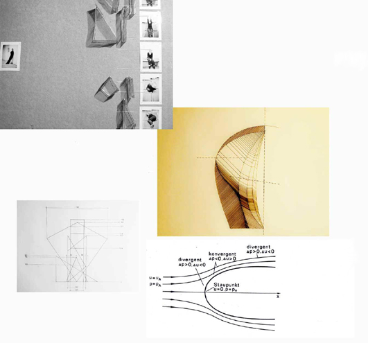 Bild 3.4 Drücke und Geschwindigkeiten in der Umgebung einer stumpfen Nase (qualitativ)